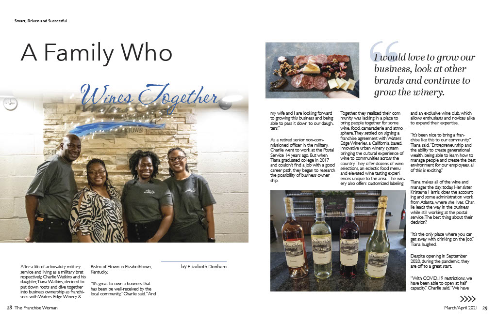 After a life of active-duty military service and living as a military brat respectively, Charlie Watkins and his daughter, Tiana Watkins, decided to put down roots and dive together into business ownership as franchisees with Waters Edge Winery & Bistro of Etown in Elizabethtown, Kentucky.