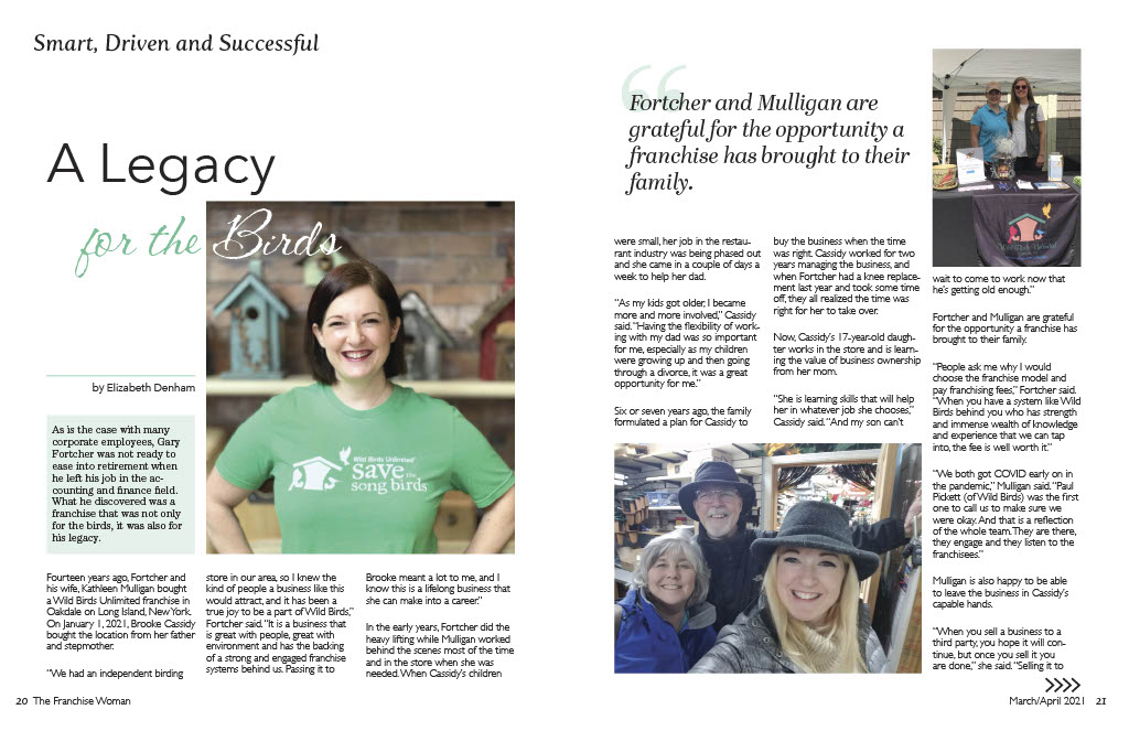 Fourteen years ago, Fortcher and his wife, Kathleen Mulligan bought a Wild Birds Unlimited franchise in Oakdale on Long Island, New York. On January 1, 2021, Brooke Cassidy bought the location from her father and stepmother.