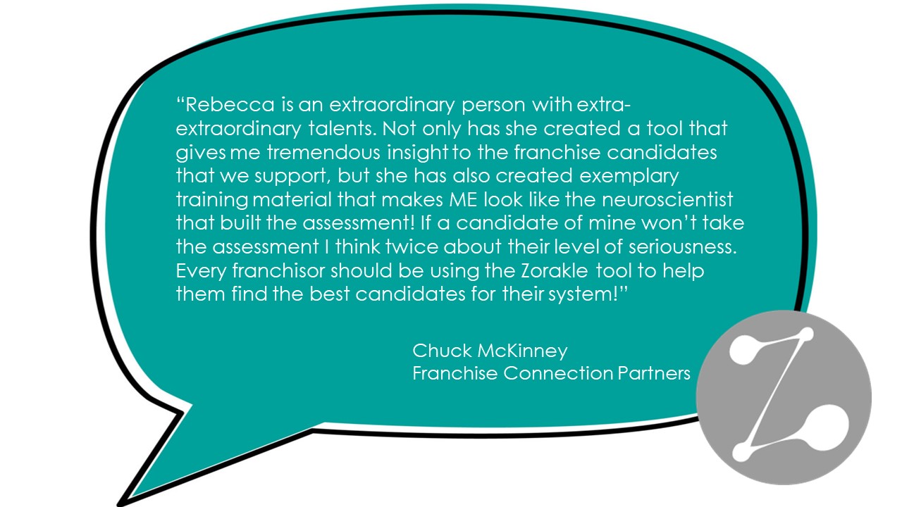 “Rebecca is an extraordinary person with extra-extraordinary talents. Not only has she created a tool that gives me tremendous insight to the franchise candidates that we support, but she has also created exemplary training material that makes ME look like the neuroscientist that built the assessment! If a candidate of mine won’t take the assessment I think twice about their level of seriousness. Every franchisor should be using the Zorakle tool to help them find the best candidates for their system!”