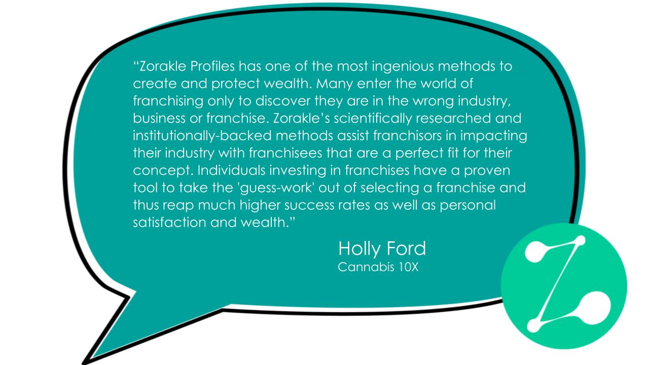 “Zorakle Profiles has one of the most ingenious methods to create and protect wealth. Many enter the world of franchising only to discover they are in the wrong industry, business or franchise. Zorakle’s scientifically researched and institutionally-backed methods assist franchisors in impacting their industry with franchisees that are a perfect fit for their concept. Individuals investing in franchises have a proven tool to take the ‘guess-work’ out of selecting a franchise and thus reap much higher success rates as well as personal satisfaction and wealth.”