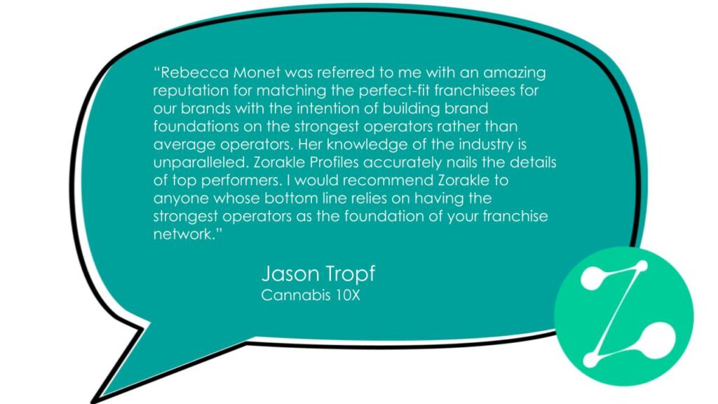 “Rebecca Monet was referred to me with an amazing reputation for matching the perfect-fit franchisees for our brands with the intention of building brand foundations on the strongest operators rather than average operators. Her knowledge of the industry is unparalleled. Zorakle Profiles accurately nails the details of top performers. I would recommend Zorakle to anyone whose bottom line relies on having the strongest operators as the foundation of your franchise network.”