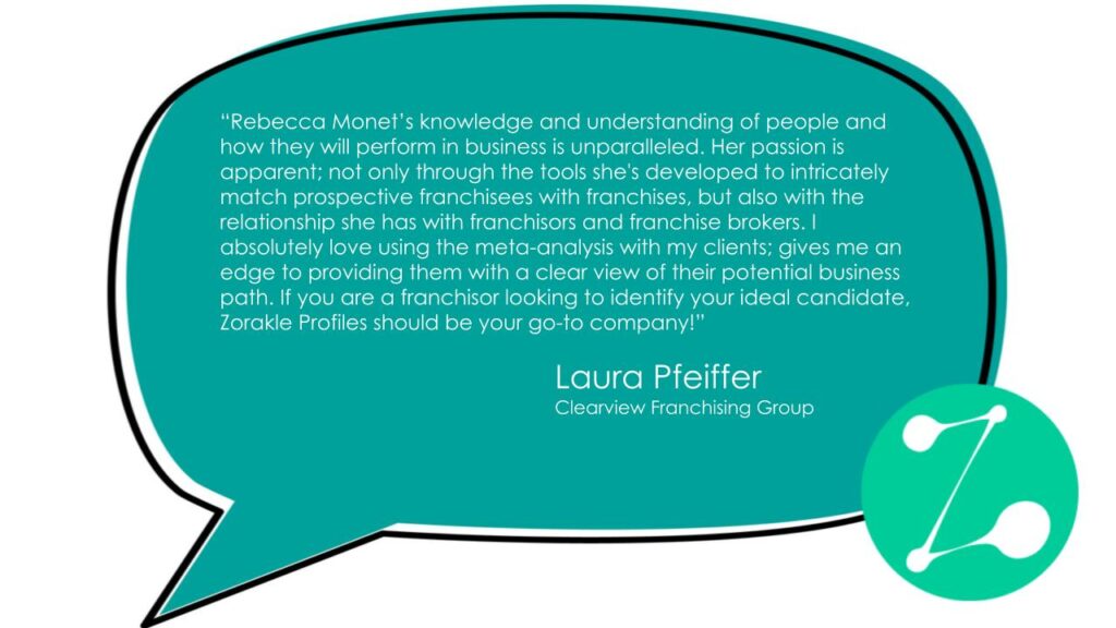 “Rebecca Monet’s knowledge and understanding of people and how they will perform in business is unparalleled. Her passion is apparent; not only through the tools she’s developed to intricately match prospective franchisees with franchises, but also with the relationship she has with franchisors and franchise brokers. I absolutely love using the meta-analysis with my clients; gives me an edge to providing them with a clear view of their potential business path. If you are a franchisor looking to identify your ideal candidate, Zorakle Profiles should be your go-to company!”